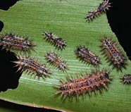 Nymphalid butterflies (Family: Nymphalidae): Some of the caterpillars from the Nymphalidae family also are covered in spines, though non-stinging. Butterflies in this family include Kamehameha butterfly (Vanessa tameame), painted lady (Vanessa cardui), red admiral (Vanessa atalanta), American lady (Vanessa virginiensis), California tortoiseshell (Nymphalis californica) and the Passion Vine Butterfly or Gulf Fritillary (Agraulis vanillae).