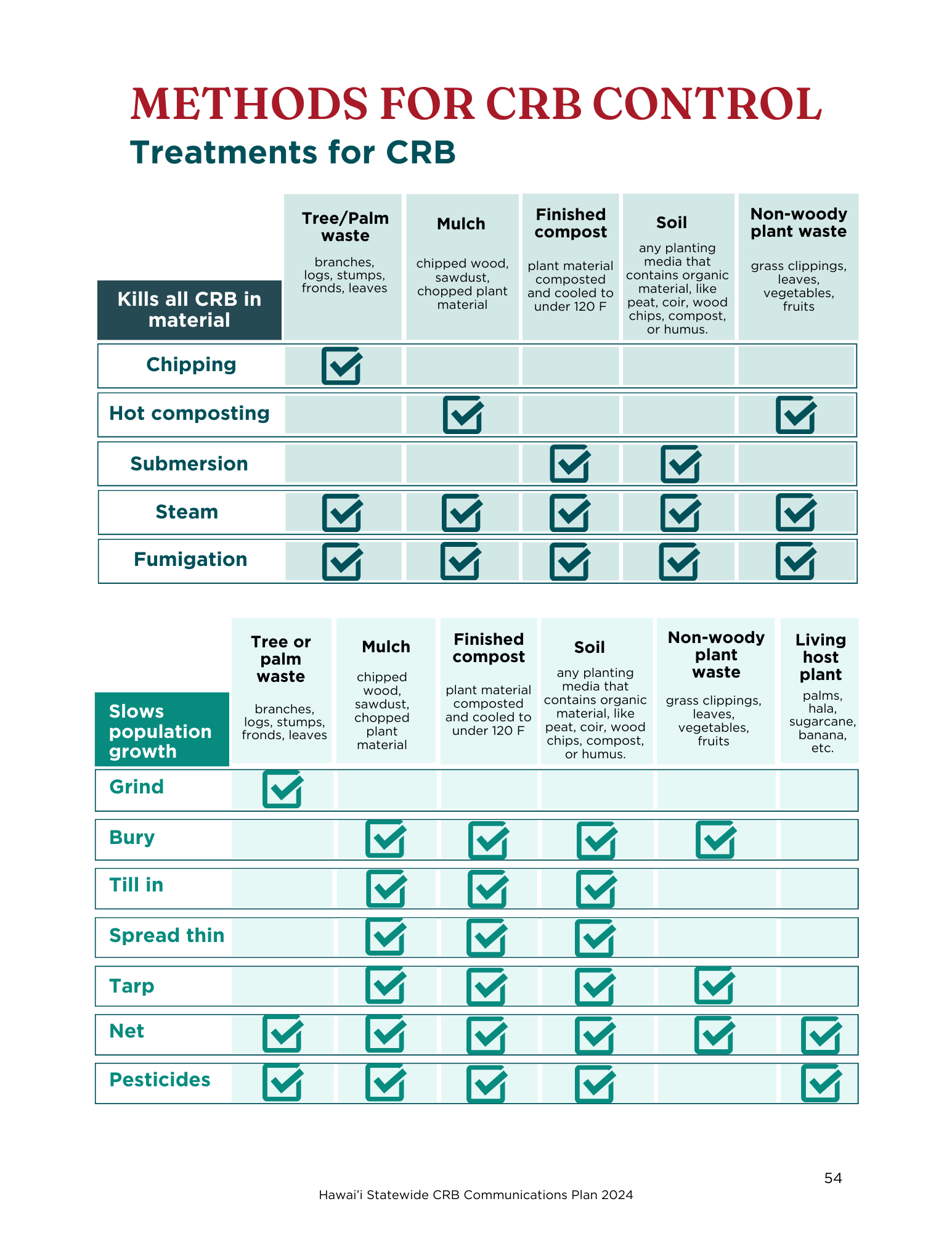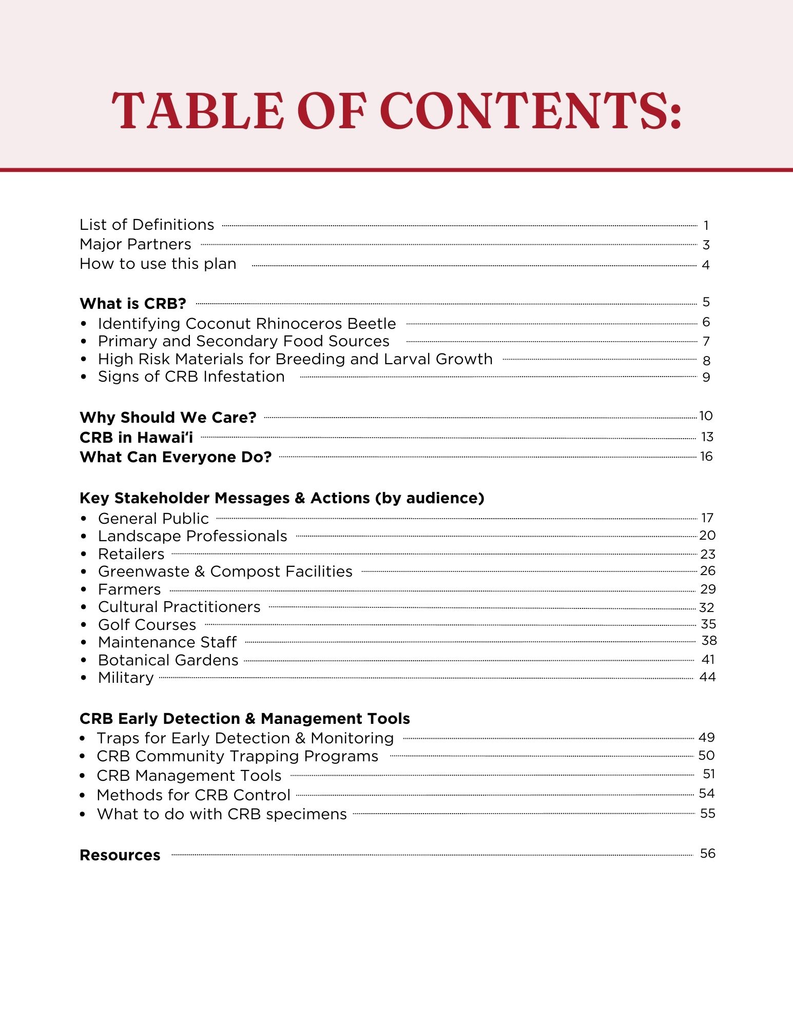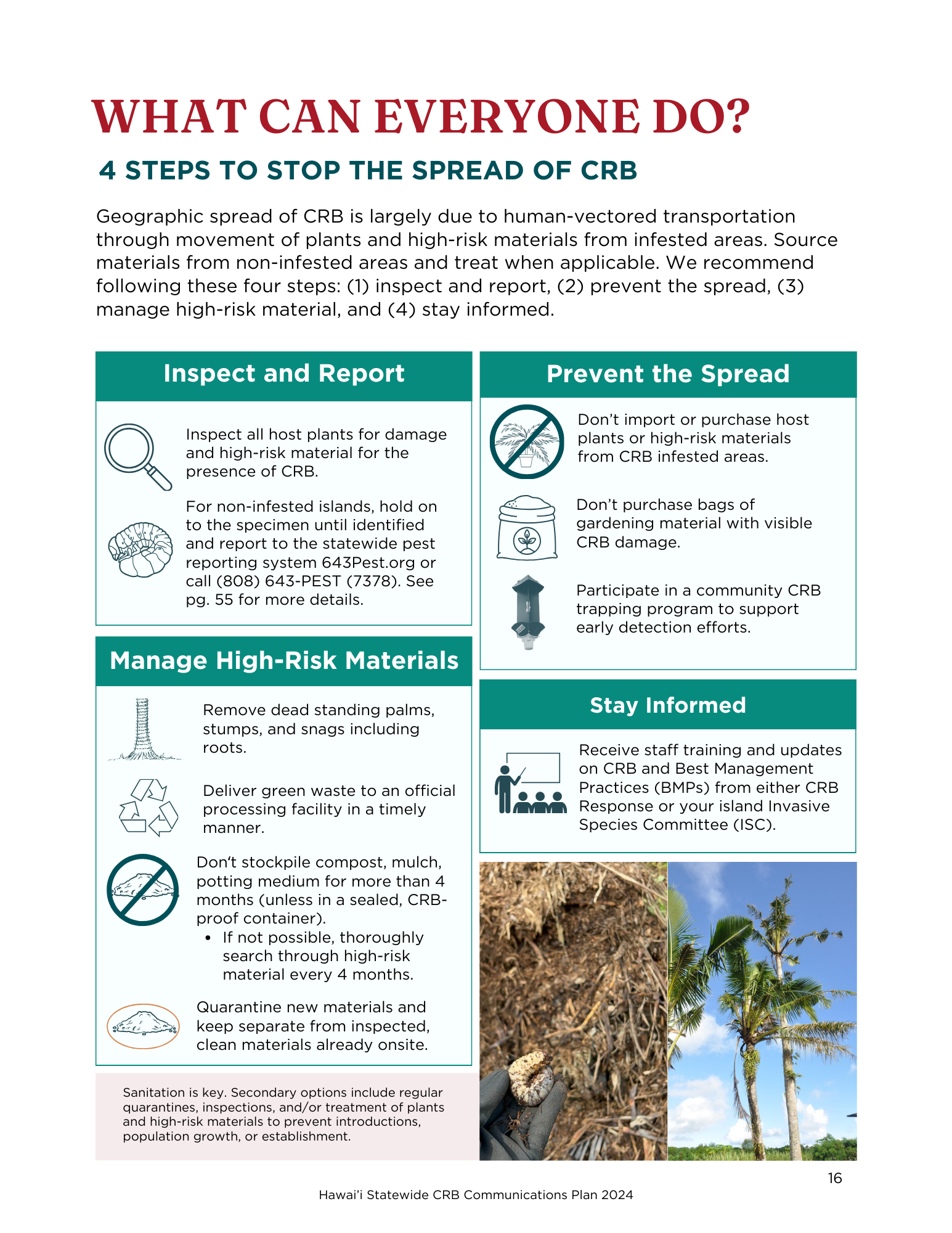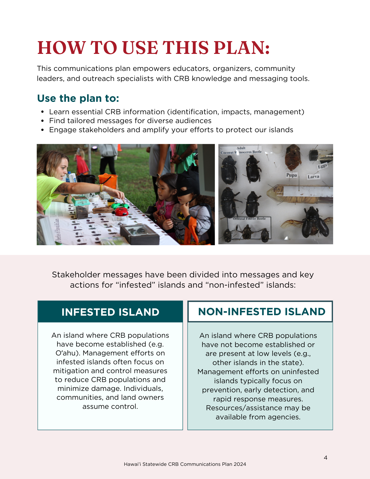 This plan serves as a compass for educators, community leaders, organizers, and outreach specialists, providing them with the essential knowledge and tools to communicate effectively about the Coconut Rhinoceros Beetle (CRB). It is a strategic resource designed to enhance understanding of CRB identification, its impacts, and the management practices necessary to protect our islands. With specific messaging tailored for diverse audiences, this guide aims to activate stakeholders across our communities to amplify our collective efforts in preserving the natural and cultural beauty of Hawai’i from the impacts of CRB.