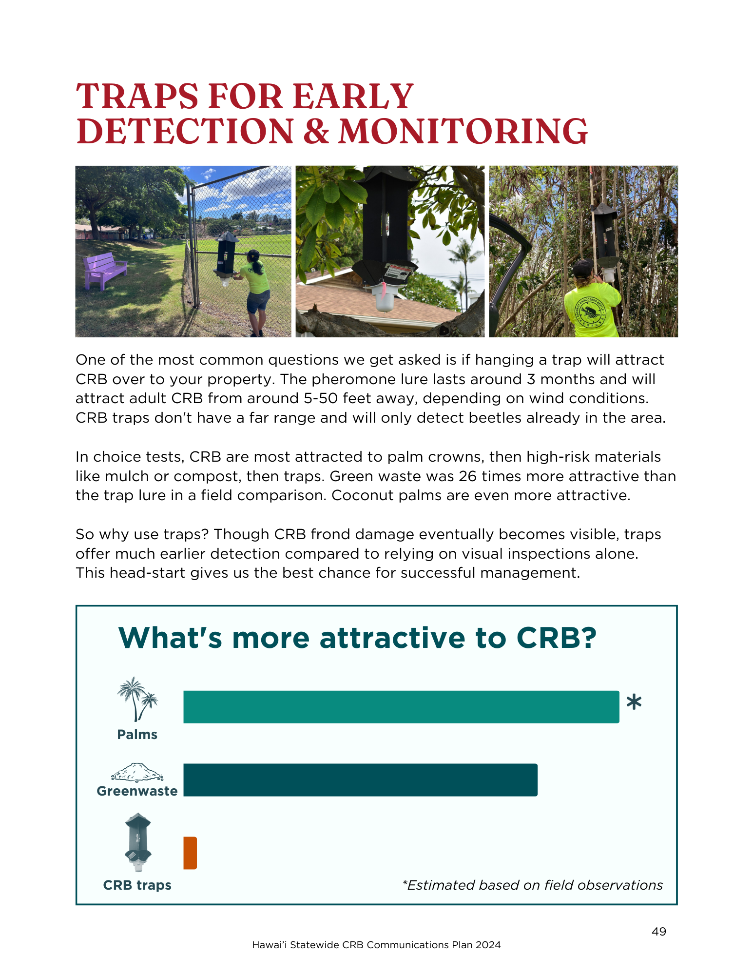 - Community Action: Participate in local trapping and monitoring initiatives. If you live on a CRB infested island, work with your neighbors to address CRB on the community level.