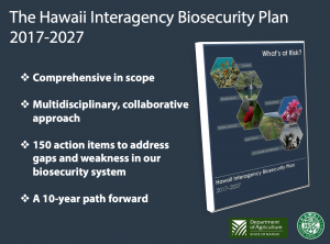 The State of Hawai‘i, in a broad coalition of stakeholders led by the Department of Agriculture and the Department of Land and Natural Resources, has adopted the State’s first interagency and comprehensive biosecurity plan to protect Hawai‘i’s agriculture, environment, economy and health.
