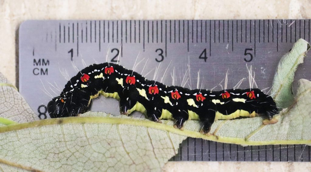 - The caterpillar evolves into a large brown and black moth (65-90 mm wingspan).