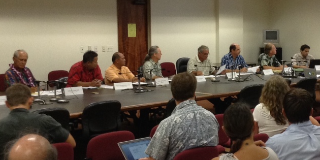 Members and legislative participants of the Hawaii Invasive Species Council review an interagency budget for invasive species projects in Fiscal Year 2015. Photo: Christy Martin