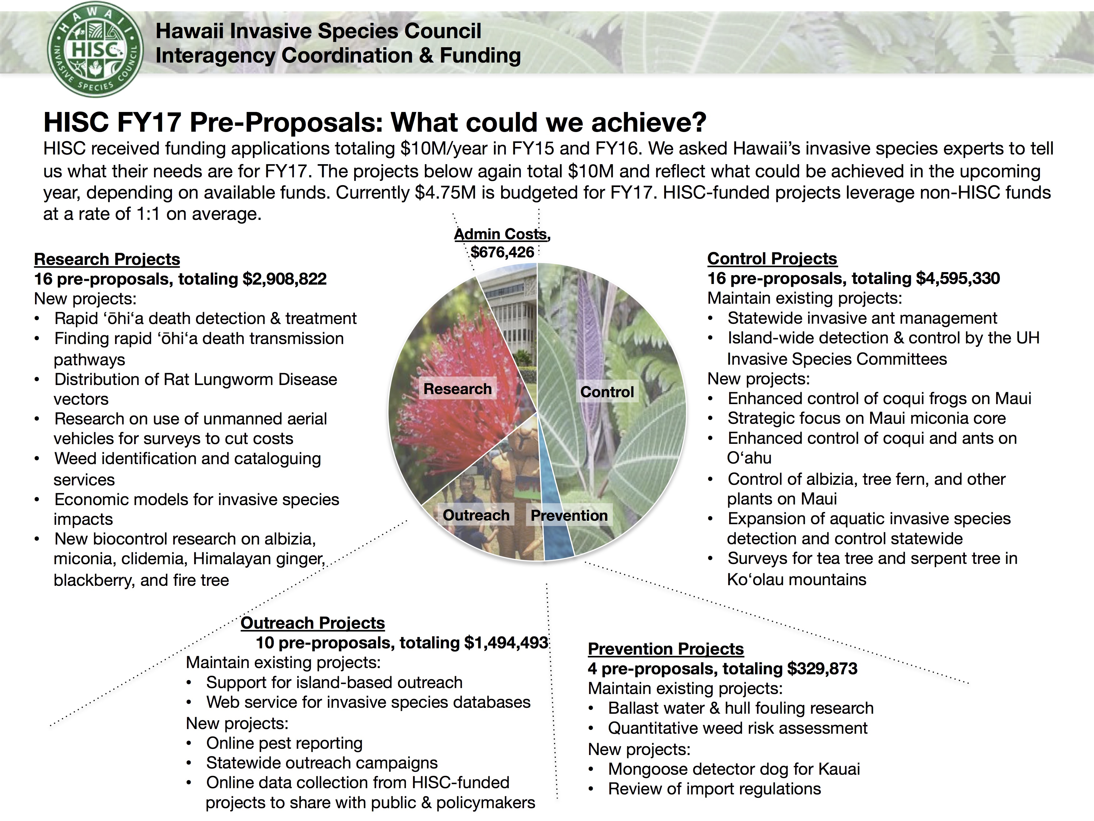 Posted on Jan 15, 2016 in Funding, sliderIn preparation for the 2016 Legislature, HISC staff asked invasive species experts in Hawaii to prepare pre-proposals for what could be achieved in FY17. HISC received 48 pre-proposals describing $10M in interagency projects. The projects below are non-binding: actual HISC expenditures in FY17 will depend on the amount of funding provided by the State Legislature and the proposals received at the time of the official FY17 Call for Proposals (late April, 2016). Individual pre-proposals are listed below.
