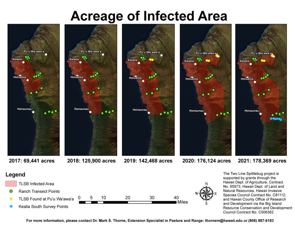 - Regulatory Status: “The Two-Lined Spittlebug (TLSB), Prosapia bicincta, was first detected in Hawai`i in 2016 and by 2021 infested 180,000 acres on Hawai`i Island. In recognition of the severe impacts of this pest, the Legislature appropriated $350,000 through Act 137 of Session Laws of Hawai`i 2021 for mitigation and control of the TLSB and recovery of the rangelands damaged by this pest.” (HDOA)