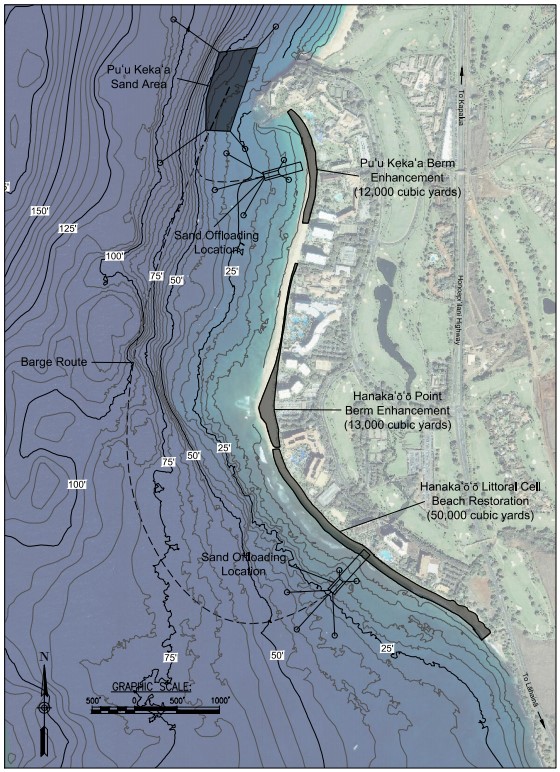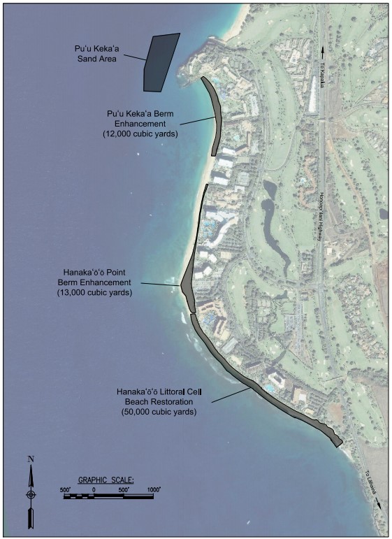 The Kāʻanapali Littoral Cell, between Hanakaʻōʻō Point and Puʻu Kekaʻa, experiences significant seasonal erosion with alternating predominant wave directions in summer and winter. Berm enhancement, or raising the elevation of the beach berm, would create a new reservoir of sand along the backshore (the upper, usually dry area of the beach) to augment the current sediment system with additional volume. This additional volume of highly compatible sand will help offset temporary beach loss during the natural seasonal erosion cycles. Sand placed at the north end of the beach would be seasonally eroded during the winter months, while sand placed at the south end of the littoral cell, at Hanakaʻōʻō Point, would be released during summer months. Both berm enhancement areas would provide a buffer during extreme erosion events by increasing total beach sand volume within the broader littoral cell. This part of the proposed project would use approximately 25,000 cubic yards of sand to raise the beach berm elevation by 3.5 feet along most of the Kāʻanapali Littoral Cell (Figure 2). The berm enhancement area would extend from the vegetation in the backshore to the berm crest, at the mauka edge of the beach face.