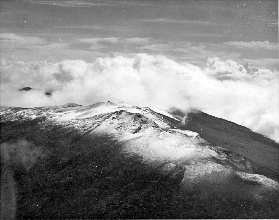 Aerial view of the summit of Mauna Kea blanketed with snow; a sign the snow goddess Poli‘ahu has returned.