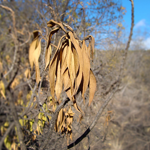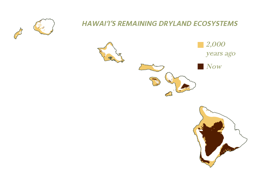 This area is naturally a dry forest ecosystem; however, global climate change is exacerbating drought severity. During drought, stressed māmane trees produce less pods—or none at all—meaning there are fewer pods for Palila to eat. As a result, fewer nestlings are hatched, causing the overall population to decline.