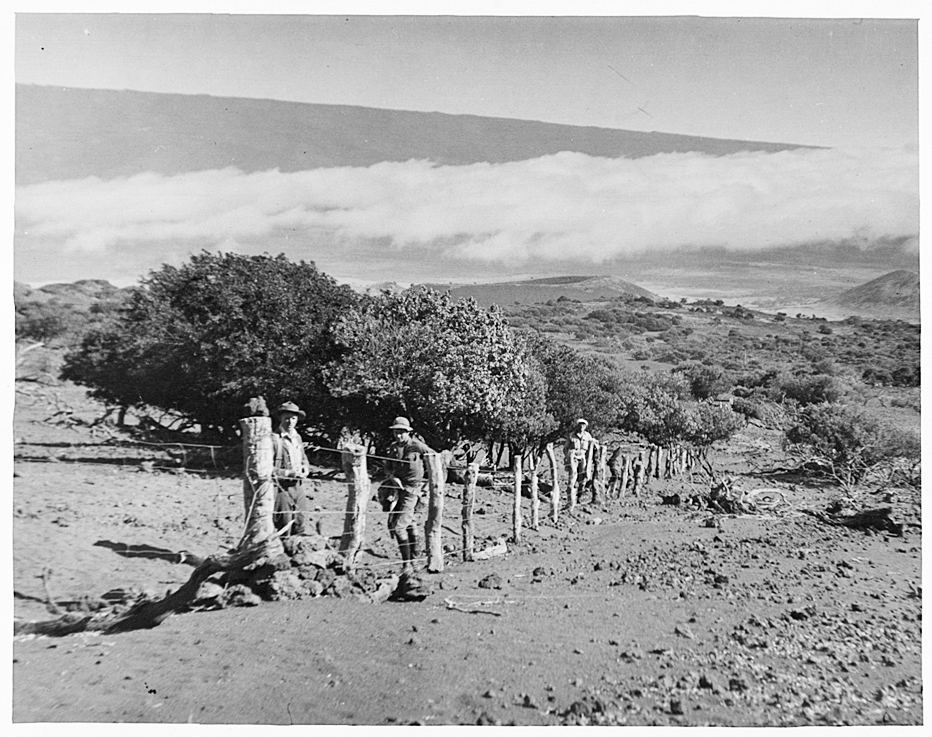 The Territorial Division of Forestry intensified efforts to eradicate feral sheep from the Mauna Kea Forest Reserve in the 1930s after noticing a lack of natural regeneration and damage to māmane trees caused by sheep. With the help of the Civilian Conservation Corps (CCC), territorial foresters built a 55-mile fence around Mauna Kea in 20 months. It was 4.5-foot tall galvanized stock wire stretched between large māmane posts.