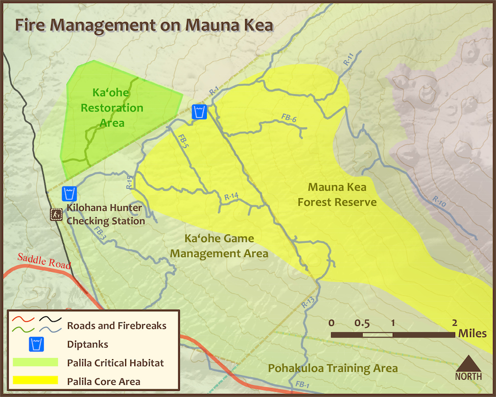 Minimizing fire’s destructive impactsThe Mauna Kea Wildland Fire Management Plan was completed in 2011 to strategize protection of palila critical habitat from fires. DLNR is maintaining roads and firebreaks which, in case of a fire, reduce the risk of fire spreading to a larger area. Additionally, in 2014 DLNR will install two 40,000 gallon water tanks in palila critical habitat to assist with future fire-fighting efforts. Each holding tank will feed a smaller, open fire dip tank that will be accessed by helicopters equipped with dip buckets.