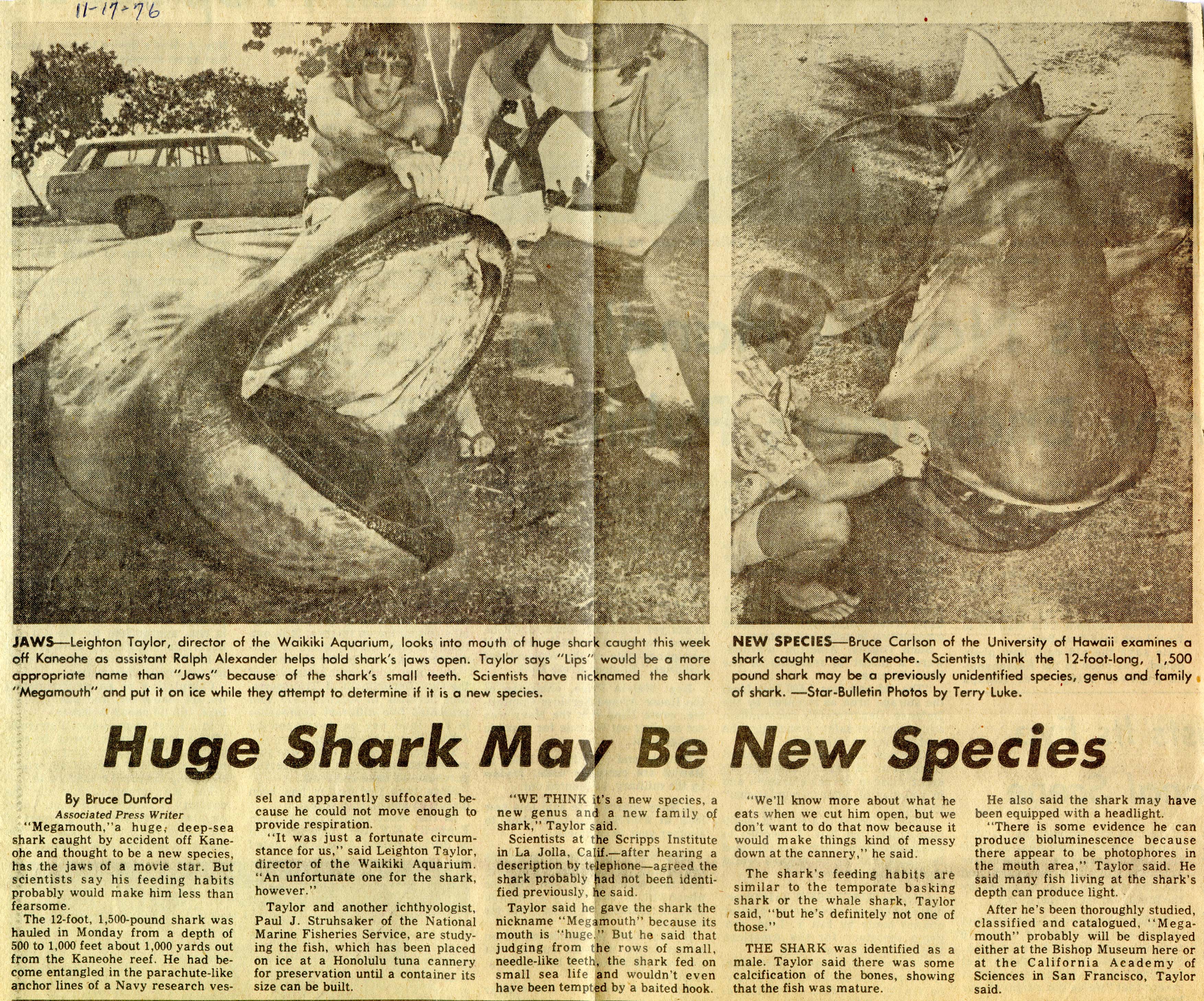 On November 15, 1976, a U.S. Navy research ship was operating in deep waters about 25 miles off Kahuku Point, the northern-most spot on O‘ahu. The crew had deployed two large parachute-like sea anchors to a depth of 500 feet, in order to hold the ship in position. When the sea anchors were hauled up, one of them had entangled a 14-1/2 foot shark, the likes of which nobody had ever before seen. The shark did not survive.