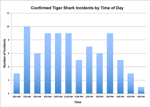 - Stay out of the water at dawn, dusk, and night, when some species of sharks may move inshore to feed. But be aware that tiger sharks are known to bite people at all times of the day. (See graphic below.)