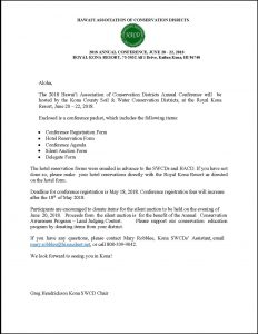 Thank you to the Kona Soil and Water Conservation District for hosting this year’s HACD Annual Conference!  Everyone had a wonderful time and enjoyed the beautiful ocean views and great service provided by the Royal Kona Resort.  Representatives and guests from 16 Hawaii SWCDs, as well as their partners from various federal, state and county agencies, shared information about their latest projects, discussed important issues facing agriculture in Hawaii today and enjoyed time with peers.  While the first day of the conference provided a wealth of information through discussion and presentations, that evening was filled with great conversation and a lively, fun-filled auction (all proceeds from the auction go to supporting the Hawaii State Conservation Awareness Program).  The second day of the conference allowed participants to explore the scenic areas of Kona through a tour that visited various farms such as South Kona Fruit Stand, Greenwell Farms and The Vanillerie.  During the last day of the conference, participants got back to business during the HACD Annual Executive Board Meeting.  Thank you to all who participated and also to those who donated items to the auction.  If you’re interested in conservation, agriculture, or just just plain interested, please be sure to join us next June as Molokai- Lanai SWCD hosts our 2019 HACD Annual Conference on Molokai (information will be posted as it becomes available)!