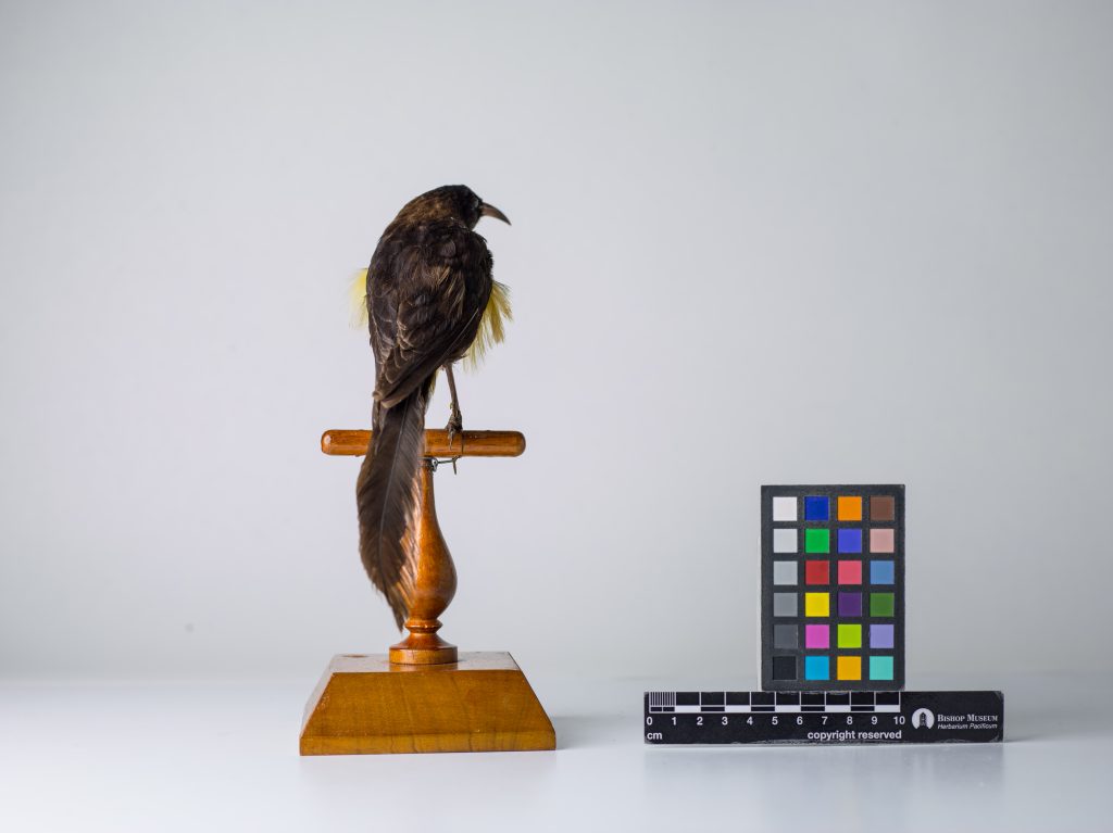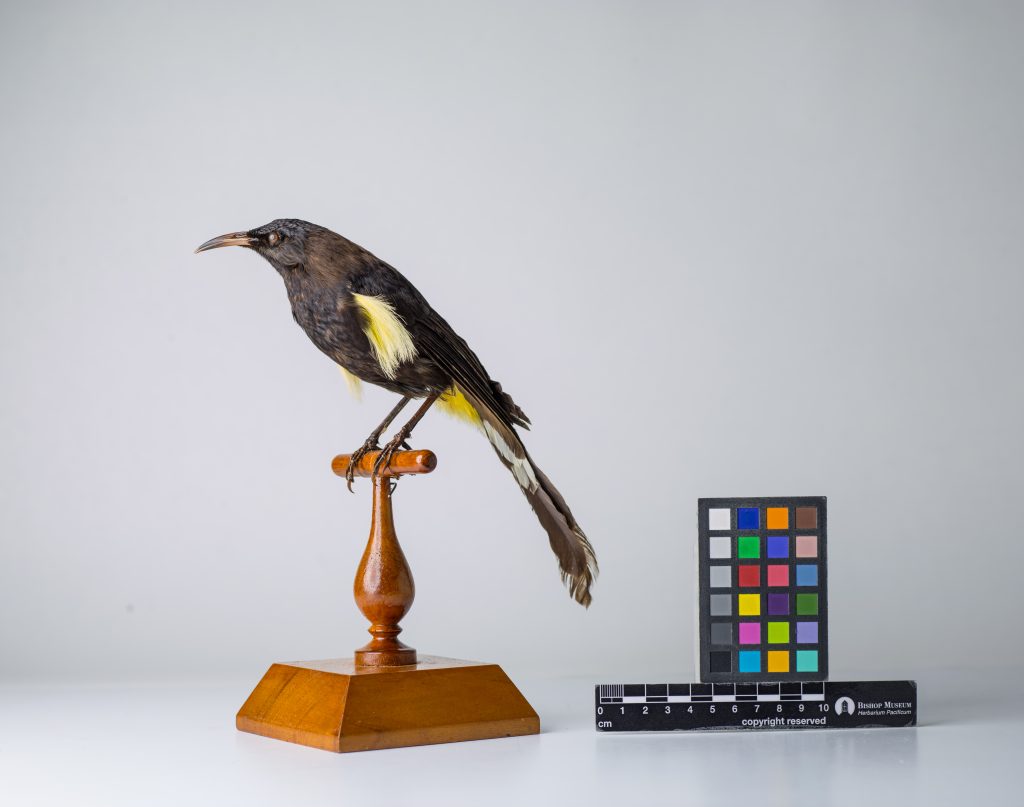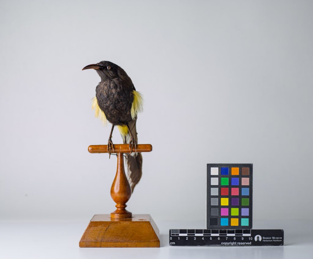 This family colonized Hawaiʻi 14-17 million years ago. These Hawaiian Honeyeaters pollinated the lobeliad plants that have existed in Hawaiʻi for 13 million years (Fleisher and McIntosh 2001, Fleischer et al. 2008, Banko and Banko 2009). Very little is known about this historic species, beyond the use of the Native Hawaiian’s use of their yellow feathers for decorative purposes (Lepson 1998). Unfortunately, birds with plumage such as the Hawaiʻi ʻŌʻō were kept in cages, to have on display and later be plucked for their feathers. (Pérez 2021). A related species of ʻōʻō exists still on Kauaʻi, but this Hawaiʻi species went extinct in 1902.