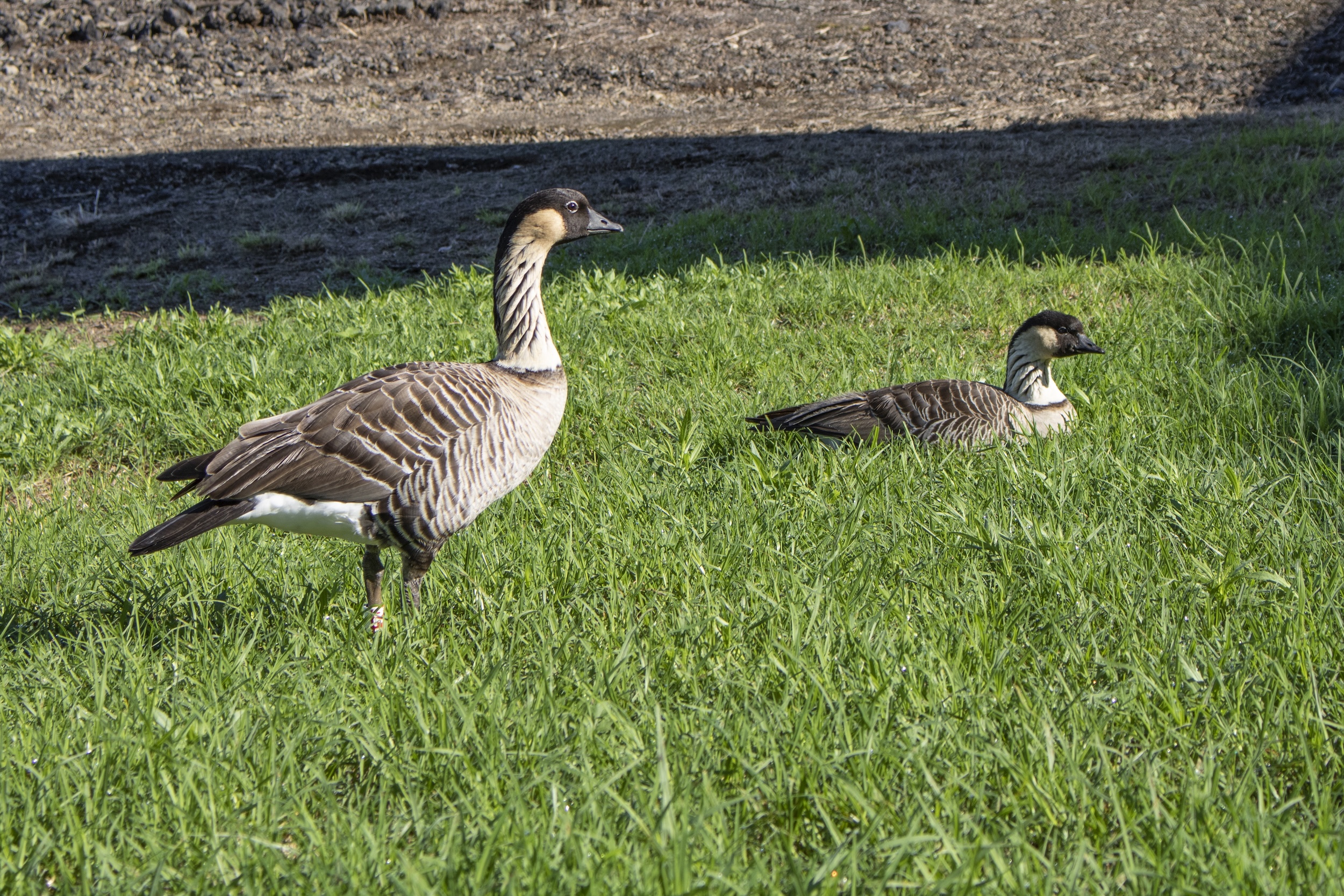 Historically, at least five species of geese occurred in Hawai‘i. Today, only the nēnē, or Hawaiian goose, survives. Adults are mostly dark brown or sepia with a black face and crown, cream-colored cheeks, and a pale yellow-to-white neck with black streaks. Females are smaller than males. Compared to other geese, nēnē are more terrestrial and have longer legs and less webbing between their toes, which likely facilitates walking on hardened lava.