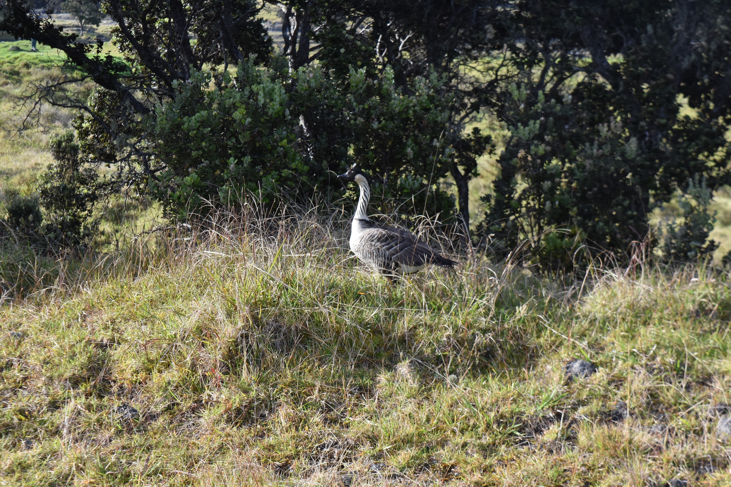 Nēnē historically occurred in lowland dry forest, shrubland, grassland, and montane dry forest and shrubland. Current habitat preferences are likely biased by the location of release sites of captive-bred birds. They currently use a wide variety of habitats, including coastal dune vegetation and nonnative grasslands (e.g., golf courses, pastures, rural areas), sparsely vegetated low- and high-elevation lava flows, midelevation native and nonnative shrubland, early successional cinderfall, cinder deserts, native alpine grasslands and shrublands, and open native and nonnative alpine shrubland-woodland community interfaces. Nesting occurs in a variety of habitats, including beach strand, shrubland, grassland, and lava rock, and at a range of elevations. On the islands of Hawai‘i and Maui, most nests are built under native vegetation, such as pūkiawe (Styphelia tameiameiae), ‘a‘ali‘i (Dondonaea viscose), and ‘ōhi‘a (Metrosideros polymorpha). On Kaua‘i, however, most nesting areas are dominated by nonnative species, and nēnē often nest under Christmas berry (Schinus terebinthifolius), shrub verbena (Lantana camara), and ironwood (Casuarina spp.). The condition of habitats occupied by nēnē varies considerably. Many of the areas used by the species are managed for conservation by the State of Hawai‘i and the U.S. Fish and Wildlife Service (USFWS).