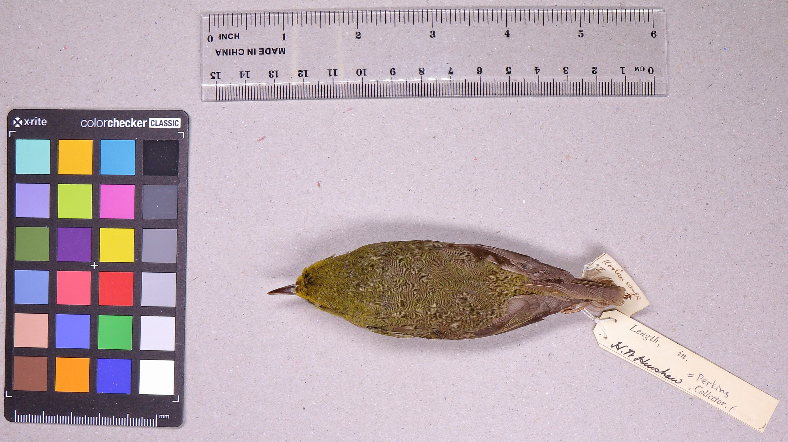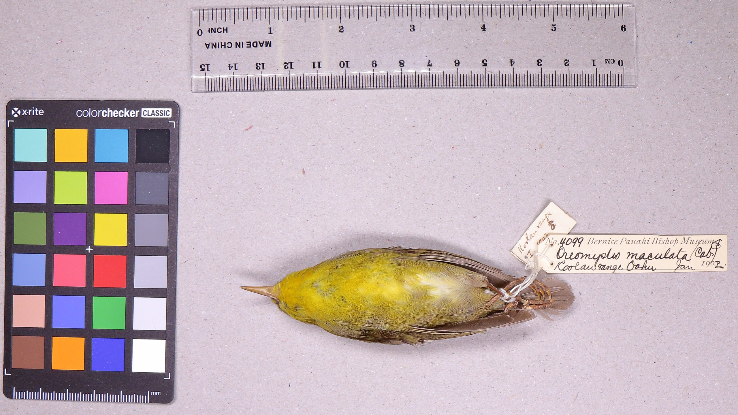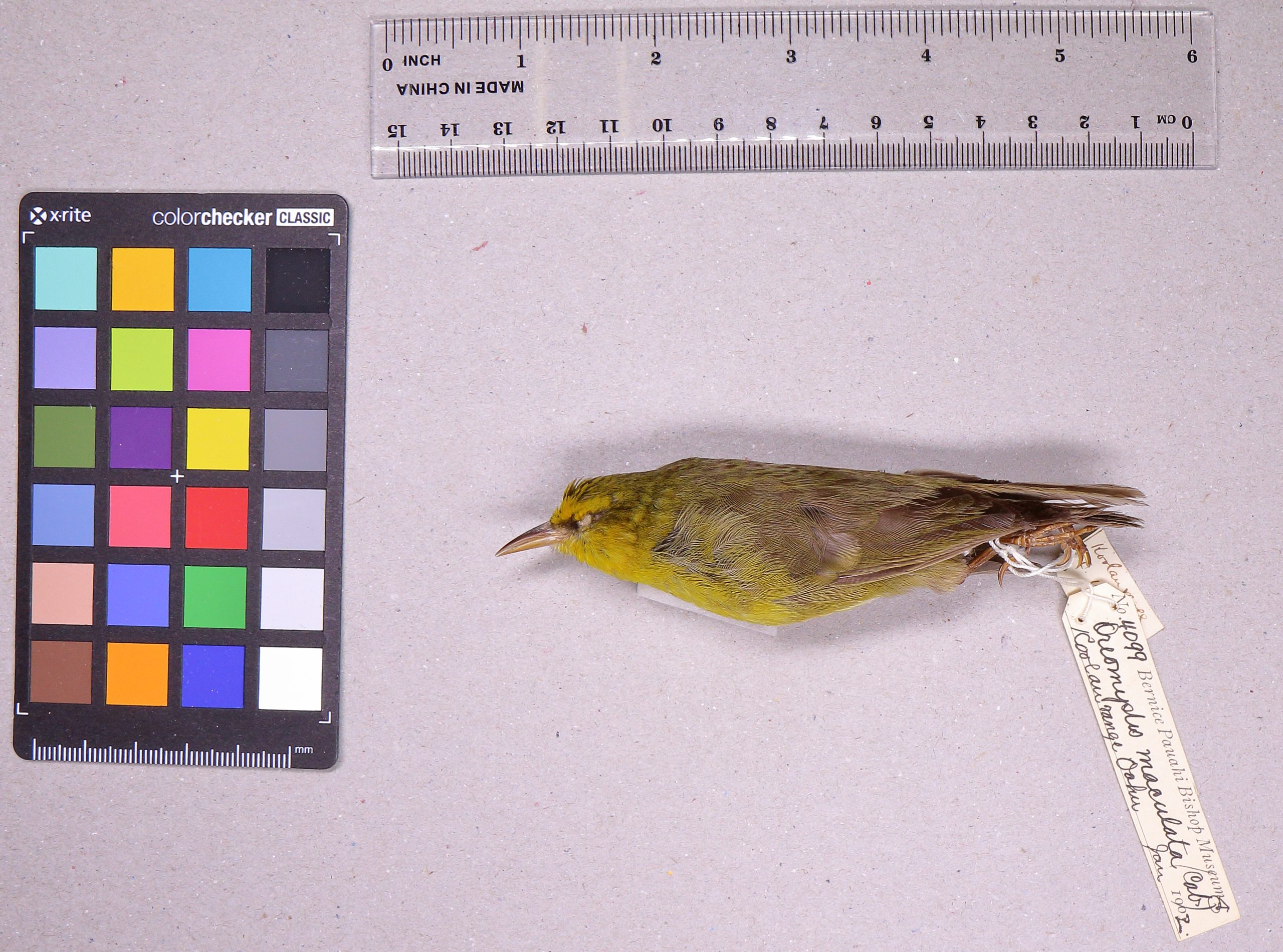 The O‘ahu ‘alauahio is a small and insectivorous Hawaiian honeycreeper (Family: Fringillidae) endemic to O‘ahu. Males are olive-green above with bright yellow underparts and forehead, females are grayish-green above and yellowish white below. The plumage of this species is very similar to that of the O‘ahu ‘amakihi (C. flavus). The song of the O‘ahu ‘alauahio has never been described. The O‘ahu ‘alauahio is insectivorous and forages by methodically searching and probing the bark of large branches and tree trunks. Like other Hawaiian creepers, ‘alauahio joins foraging flocks during non-breeding seasons. Little is known about the life history or breeding biology of the species, but it is likely similar to that of the Maui creeper (P. montana).